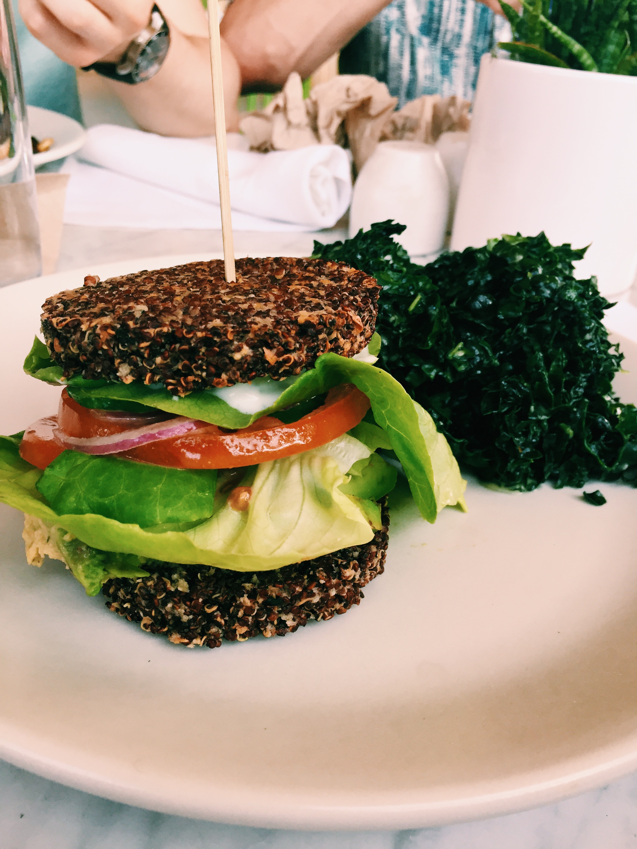 My go-to order at True Food is their Inside Out Quinoa Burger. The meal consists of two of their famous quinoa burgers with hummus, tzatziki, tomato, butter lettuce, cucumber, red onion, avocado, and feta (I usually leave feta off) sandwiched in between. It’s also vegetarian & gluten free friendly!
