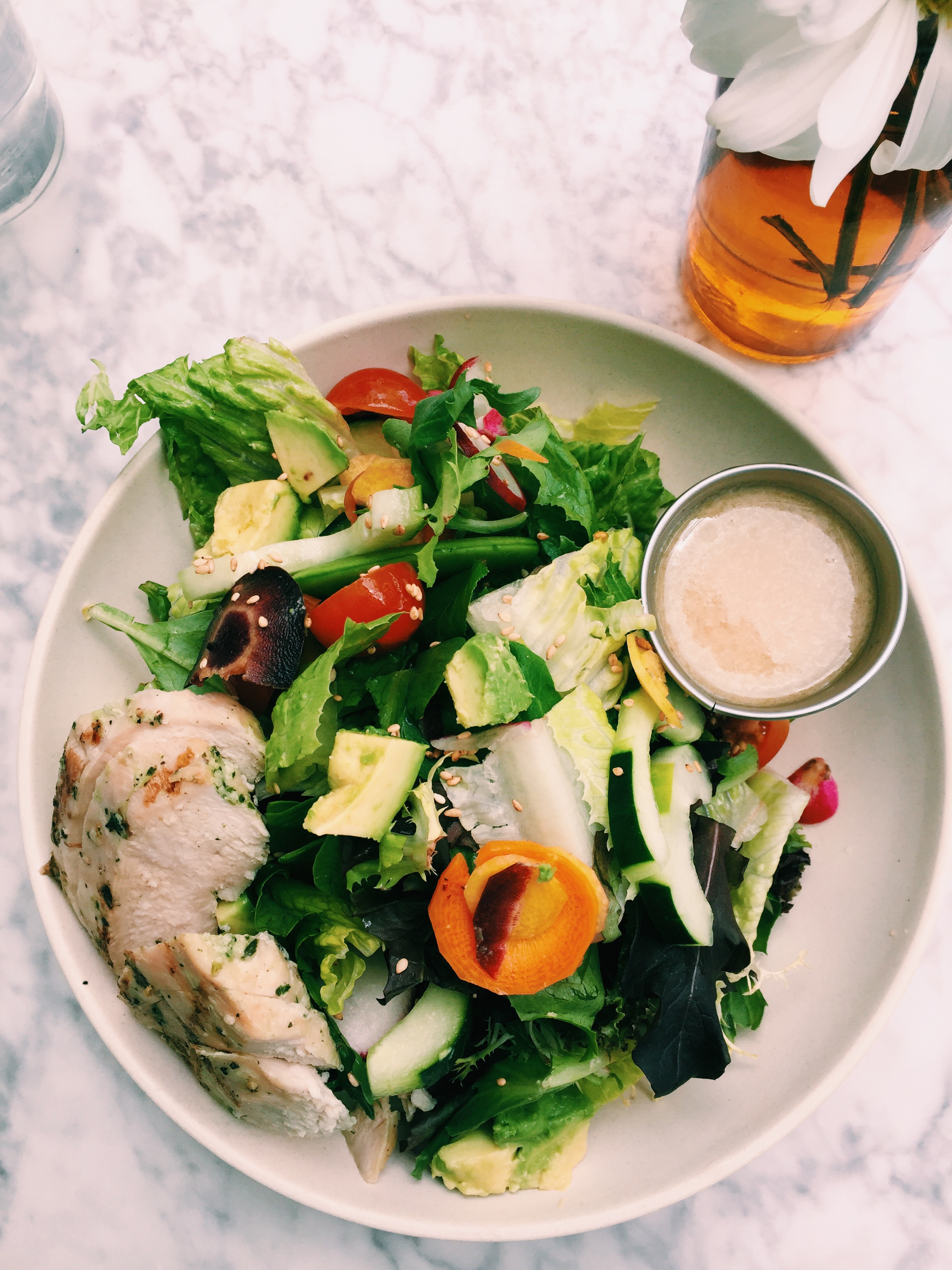 The Chopped Vegetable Salad that I love comes with organic greens, avocado, heirloom carrot, snap pea, radish, baby tomato, cucumber, toasted sesame see, and a ginger miso vinaigrette which is incredible.