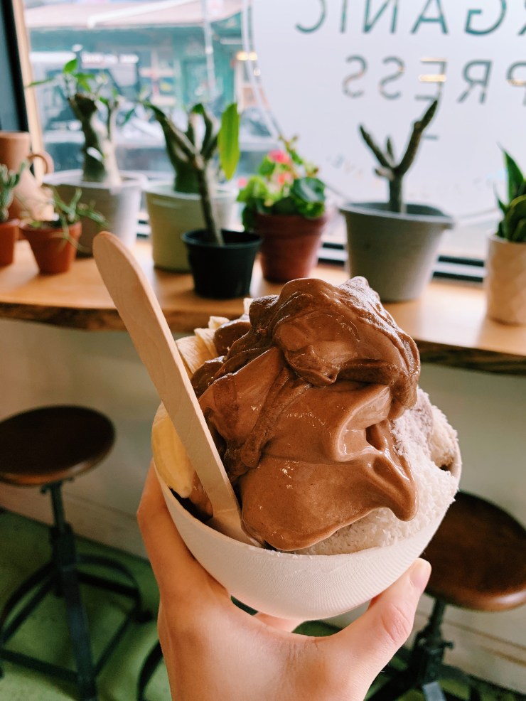 A hidden gem in the Kensington Market area of Toronto, The Good Press Organic was amazing. I saw it when we were walking, and thought to myself “That looks so cute!” We walked inside, and I was right. The shop was filled with plants (for sale!) and ceramics. The menu was simple- raw desserts, juices, homemade milks, and smoothies. I went for the “Raw Chocolate” smoothie bowl & topped it with banana slices, shredded coconut, and almond butter. It tasted like a chocolate milkshake… I kid you not… and it was incredibly thick!