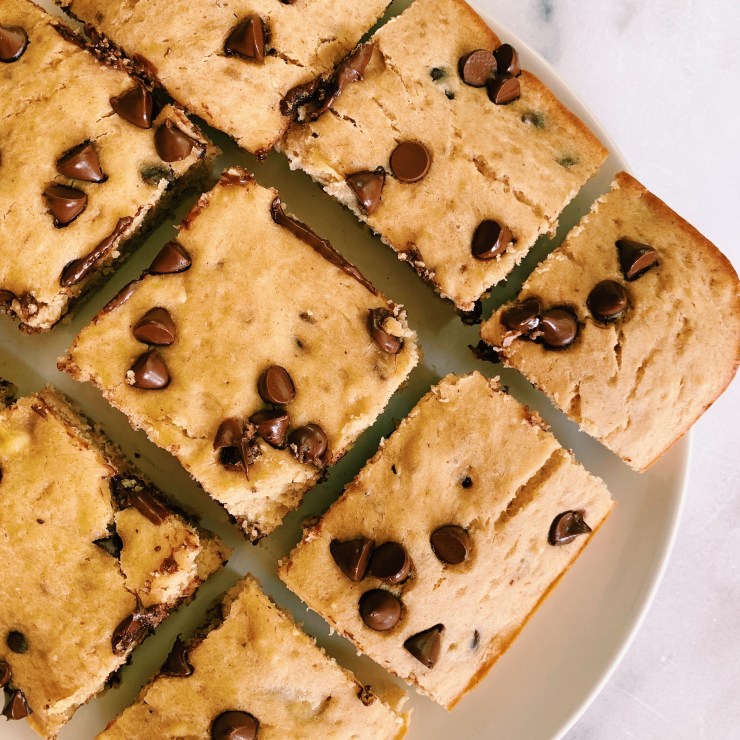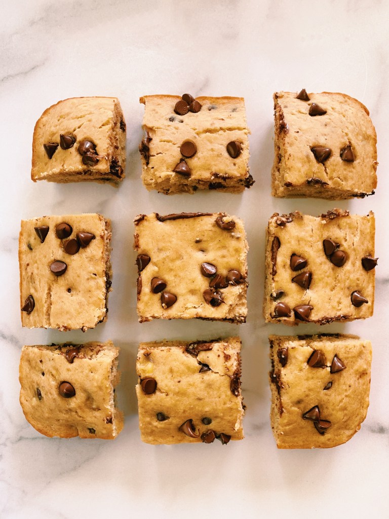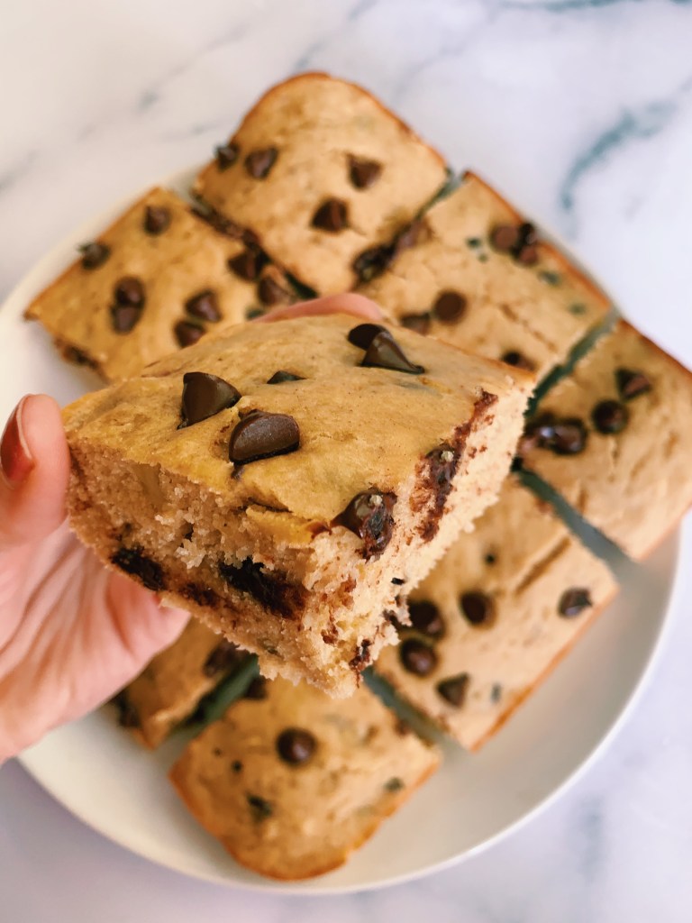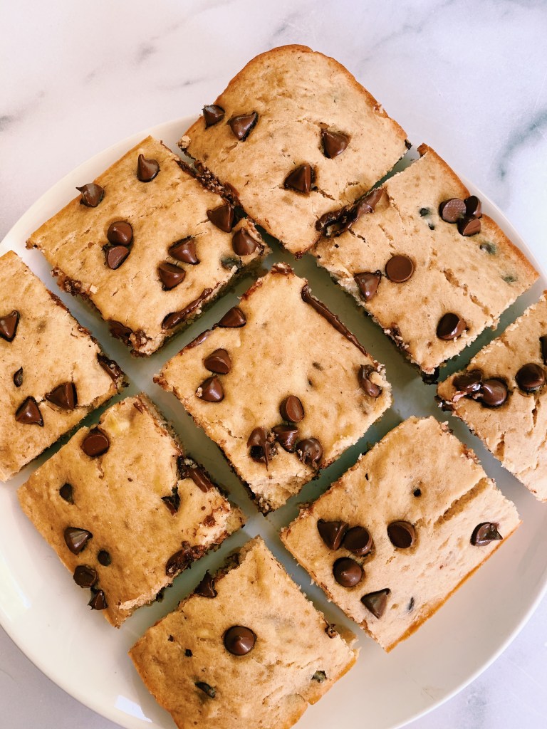 As a result, I am not presenting recipe #3 of this week to you: Banana Chocolate Chip Blondies. My Instagram followers actually requested that I “dial down” the banana recipes, but I am still going strong. I know I said that the texture of my Chocolate Chip Oatmeal Cinnamon Crunch Banana Bread was unreal, but LET ME PUT YOU ON about the fluffy thickness of these blondies.