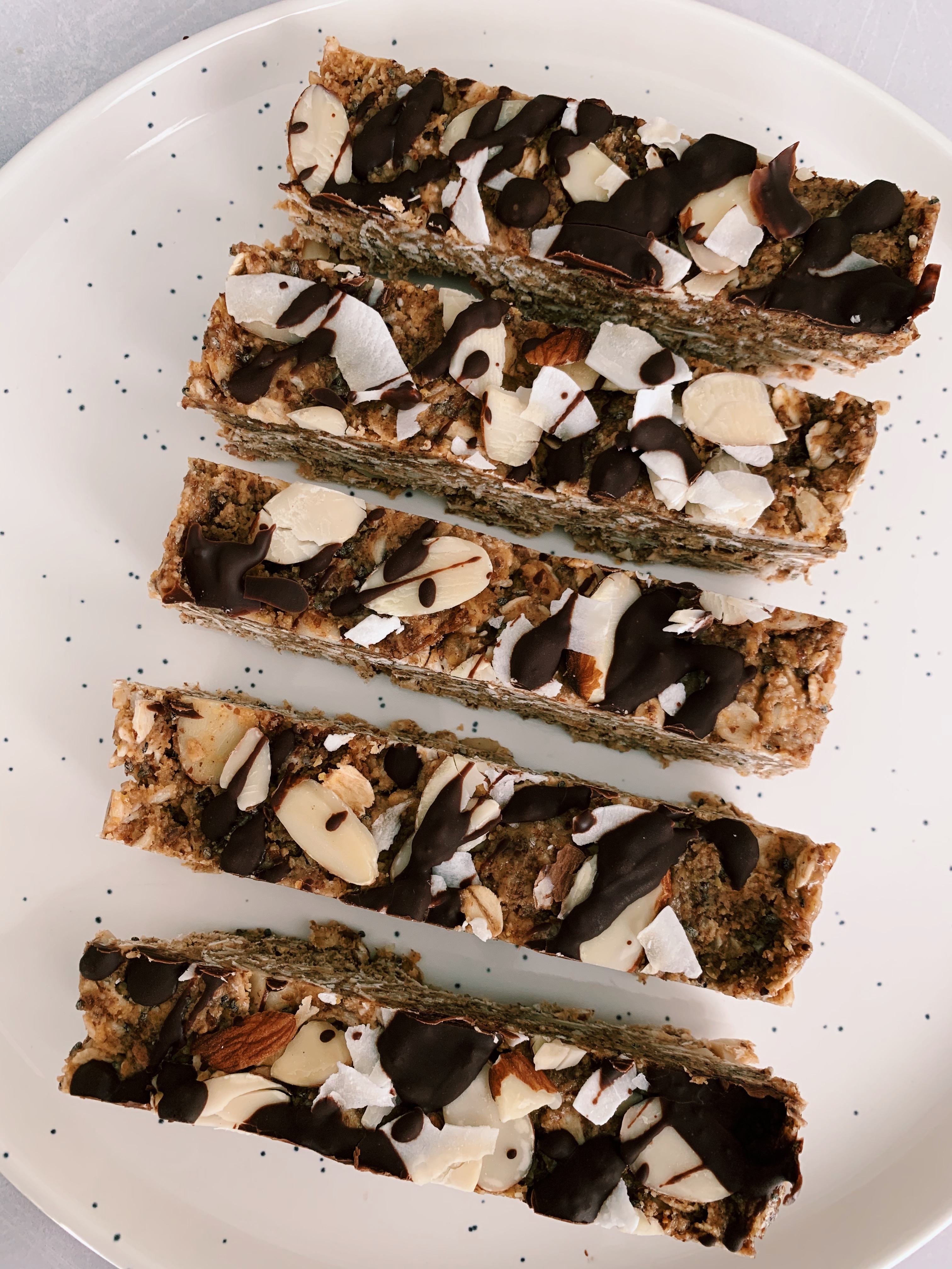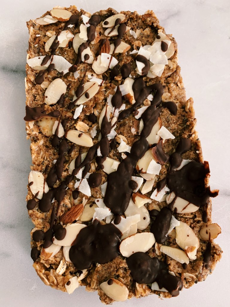 - Place dark chocolate chips and ½ teaspoon coconut oil in a microwave safe bowl. Microwave on high in 30 second increments, stirring in between until chocolate is completely smooth and melted. Drizzle diagonally over bars.