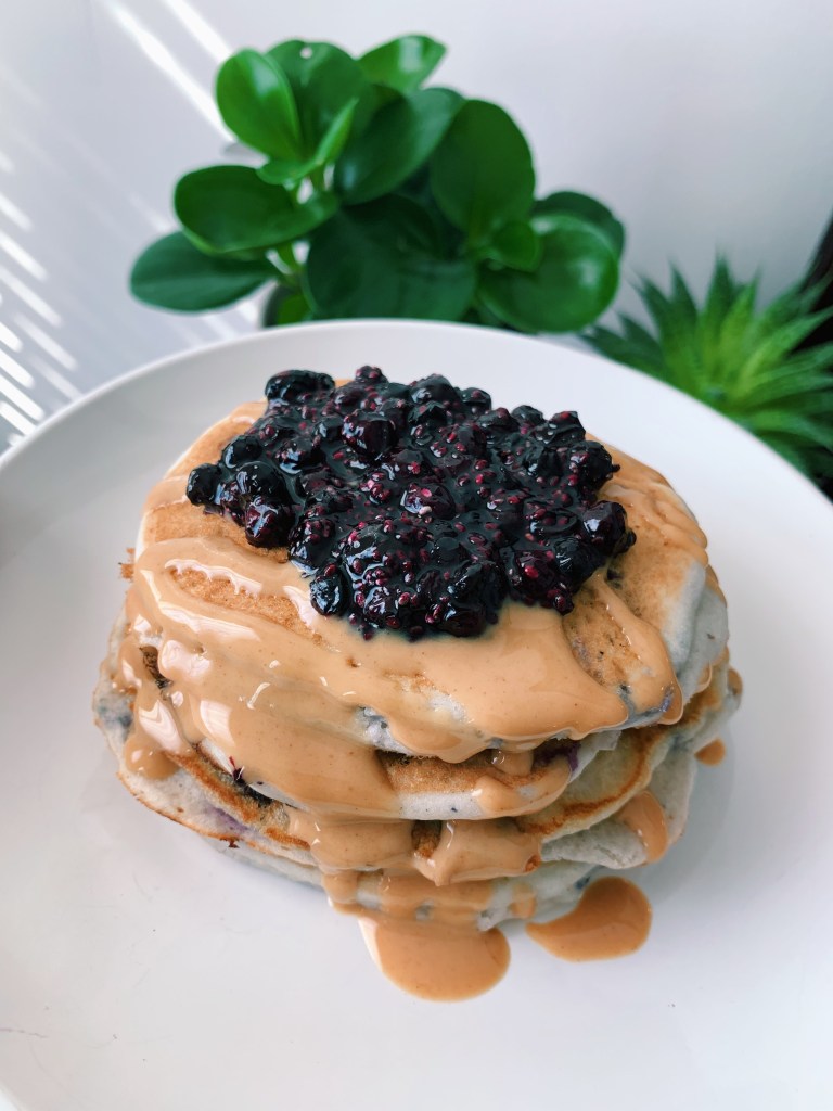 6-INGREDIENT BLUEBERRY PANCAKES with blueberry chia jam & melted peanut butter ❄️ Beyond necessary after a long walk in the snow!